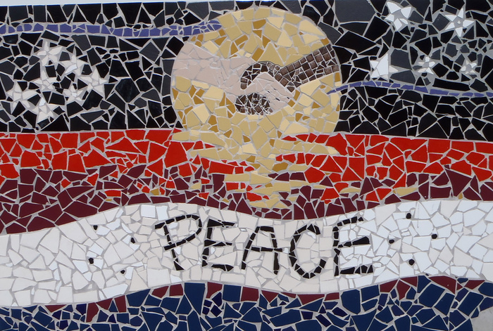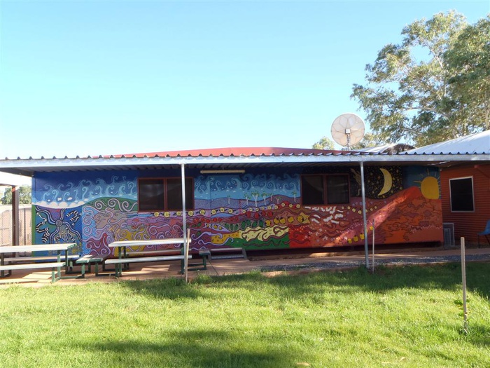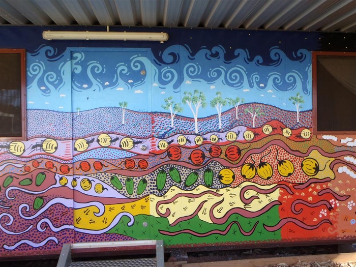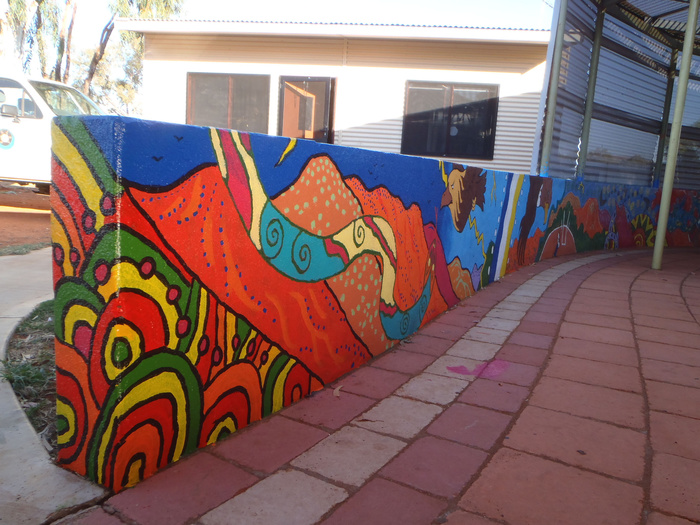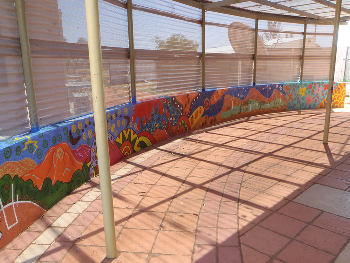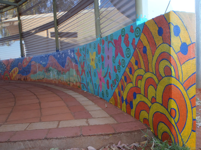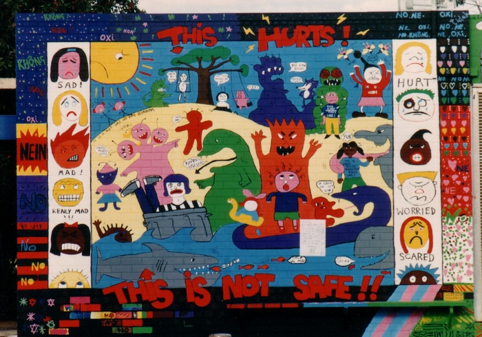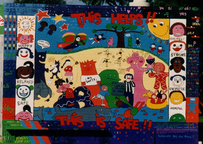 'Safe space mural' part 1, Paralowie school, South Australia 1993. Conceived, designed & painted with primary age students from reception to year 7. The school at the time, had children from over 80 different nationalities/ language traditions.