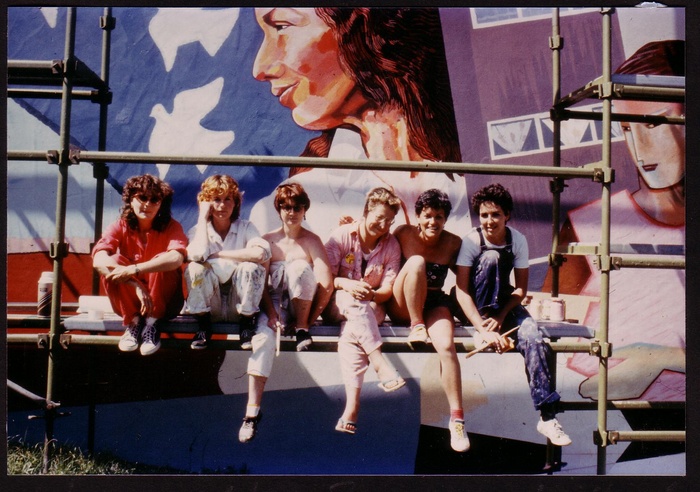 Mural painting team for the Domain mural 1982, left to right: Marie McMahon; Jan Mackay; Helen Skye; Barbary O'Brien; Carol Ruff & Merilyn Fairskye. Nora Bindul, from the Northern Territory not pictured.